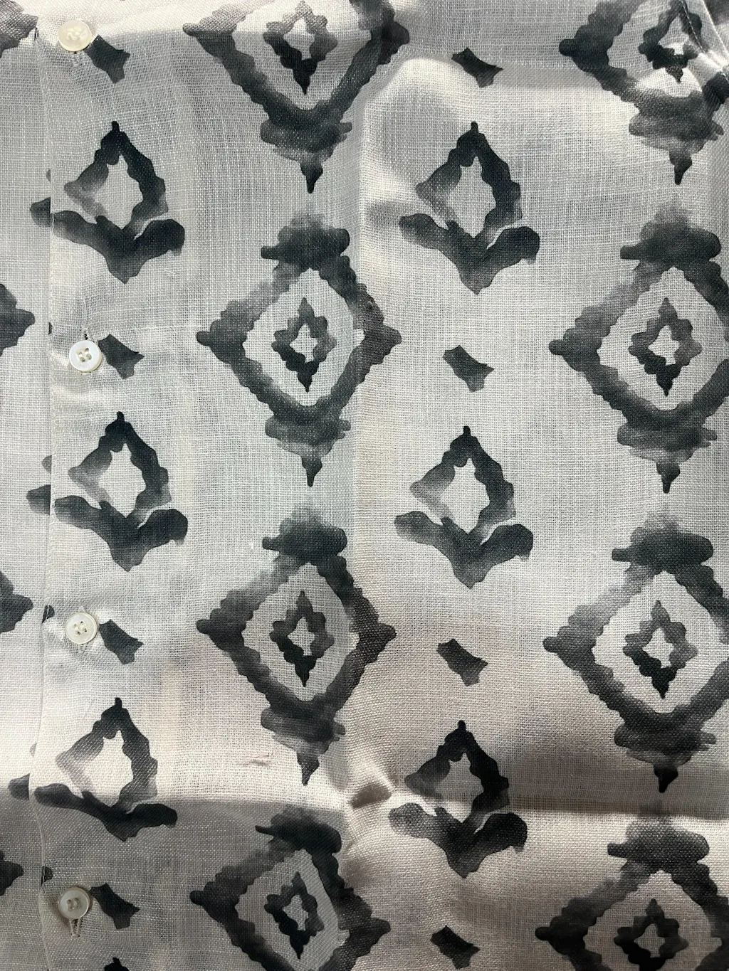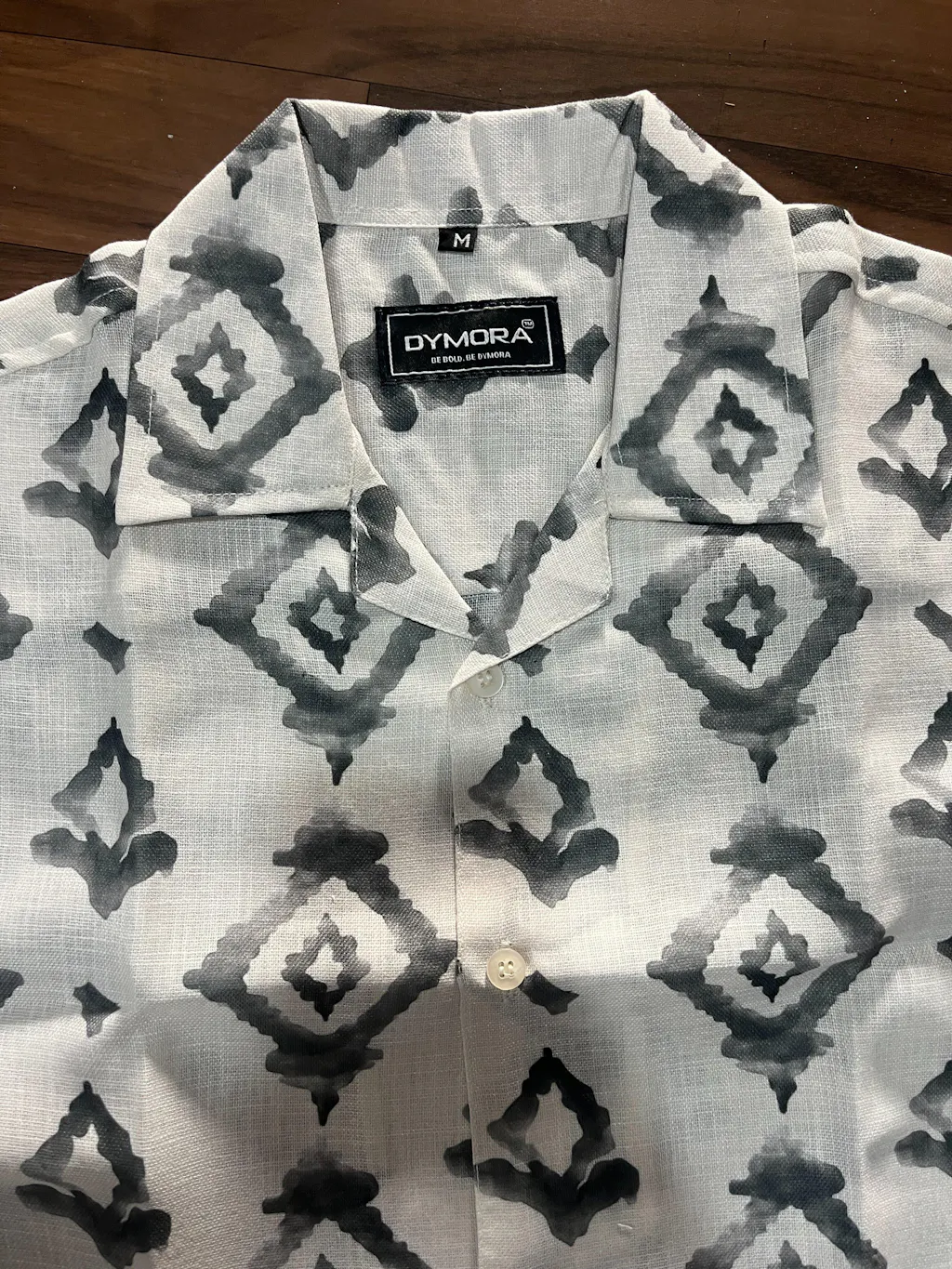 Add a refined touch to your casual collection with this men’s white and grey ikat-print shirt. Designed with a contemporary geometric pattern, it blends subtle style with everyday comfort. Its lightweight, breathable cotton fabric keeps you cool, making it the perfect choice for hot and humid weather.